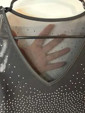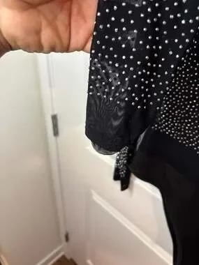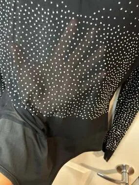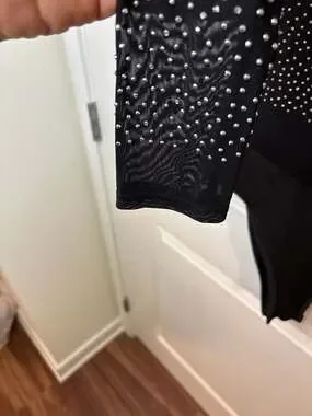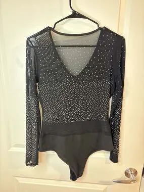 The bodysuit features a sheer mesh construction with rhinestone studs throughout for a sparkly look. Long sleeves and fitted fit. The mesh is stretchy and hugs the body. Rhinestones are intact with no loose stones.
