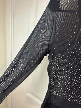 Fashion Nova Talent rhinestone studded mesh long sleeve bodysuit in black. This is a pre-owned bodysuit in good condition with normal wear from use.