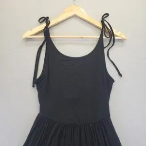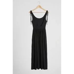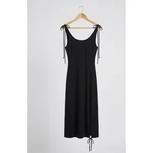 Free People FP Beach SP black midi dress with adjustable tie straps and a low scoop back. This lightweight jersey knit piece includes side pockets, a side slit with tie detail, and an elasticated waist for a comfortable, flattering fit.