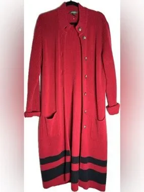 A striking vintage Lauren Ralph Lauren long cardigan in a rich, statement red—designed with a clean, elongated silhouette that effortlessly elevates any look.