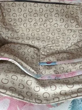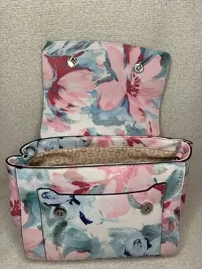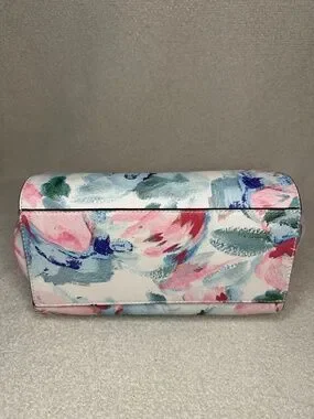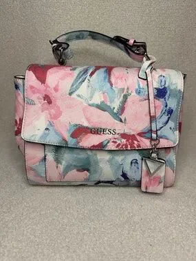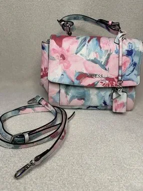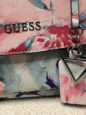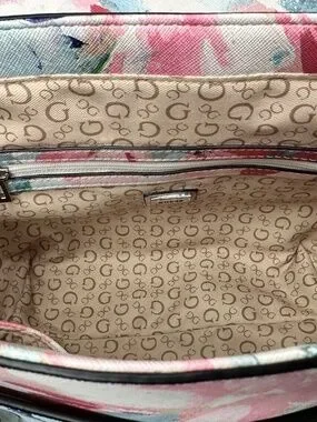 GUESS Pastel floral print bag in synthetic leather. Brushstroke pastel floral style design outside, with classic champaign Guess interior fabric. Lots of interior organization including one inside zipper pocket, 2 card holder slots and 1 general pocket. Outside charm, magnetic close and one pocket under the flap.