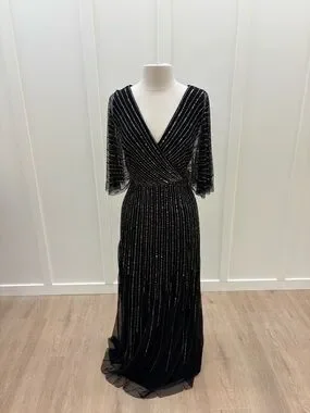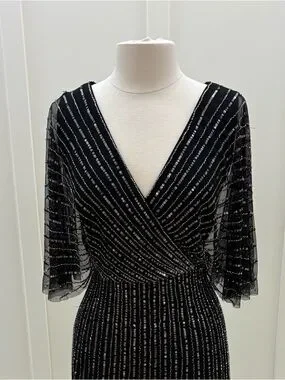 Black maxi dress with sparkling beadwork. Surplice V‑neck and short, sheer sleeves. Fitted waist leads to a flowing skirt. Subtle vertical bead lines elongate the silhouette.
