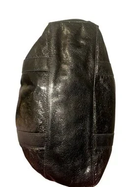 Polished black leather tote with signature logo medallion. Dual shoulder straps for easy carry. Exterior slip pockets for quick access. Trimmed accents add subtle contrast. Tory Burch dust bag included. Only call out is slight signs of wear on the handles.