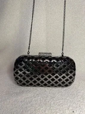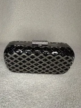 A pill shape black rhinestone clutch with gunmetal lattice details and rhinestone clasp. Chain shoulder strap included, attachable to moveable loops. Plastic interior pouch. Originally from BCBG.