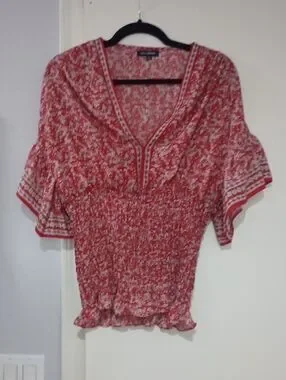 Soft red floral blouse with a V-neck. Flutter short sleeves with patterned trim. Smocked waist and ruffled hem. Lightweight breathable fabric. Versatile for casual or dressy outfits.