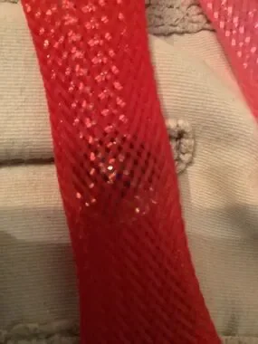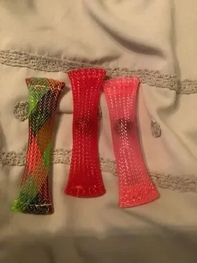 Three stretchy mesh fidget tubes. One multicolor tube with green, orange, yellow, and black. One solid red tube. One solid pink tube. Soft, flexible, and tactile.