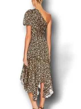 This one-shoulder midi dress features a romantic floral print with a soft puff sleeve and a flowy, tiered silhouette that moves beautifully. The longer length and lightweight fabric give it an elevated, effortless feel—perfect for brunch, weddings, or special occasions.