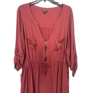This flattering burnt orange dress has a drawstring to cinch your waist for a customized fit. The soft flowy fabric has a front zipper and roll-tab sleeves for any type of weather. Easy-to-wear style perfect for daily wear or weekend plans.