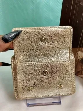 Made in Romania, this Jimmy Choi Nemo trifold wallet is champagne gold; crafted from grainy, glitter leather with star studded embellishments in various metallic shades.