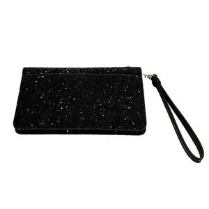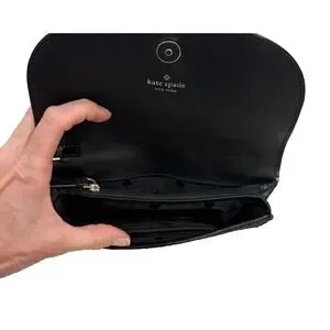The Kate Spade Glittery Evening Bag Wristlet is a stylish and elegant accessory perfect for formal occasions like weddings or parties. This rectangular bag features a snap closure, a black wrist strap, and gold hardware accents. The exterior is adorned with glitter for a touch of glamour, while the interior includes credit card slots and inner pockets for organization. Lightweight and compact, this small bag is designed for easy carrying and convenience. Perfect for adding a touch of designer flair to your evening outfit. Bag is in excellent, pre-loved condition; very clean interior and exterior; never used!