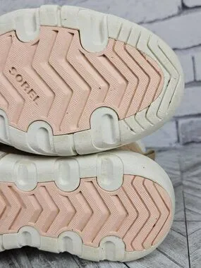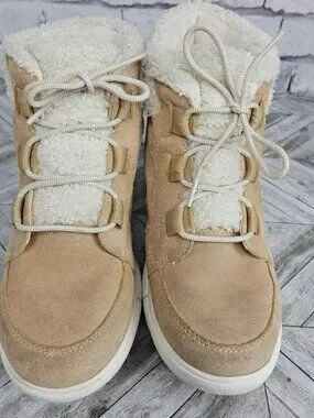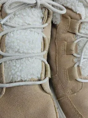 casual warm practical Step into winter warmth and style with these charming Sorel women's boots, model NL4451-262. Crafted with soft suede exterior and a plush faux fur lining, these boots ensure your feet stay cozy on chilly days. Their beige tone complements a variety of outfits, making them a versatile addition to your footwear collection. The boots feature durable laces and a pull tab for easy on and off, while the solid sole offers excellent traction and support. Designed for comfort and casual wear, these boots exhibit slight signs of use but remain in great condition, ready to keep you snug all season long. These boots combine fashion with function effortlessly!