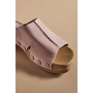 Brand new Kelsi Dagger Brooklyn blush pink suede platform clog slide sandals in women’s size 9.5. Features a soft suede upper, slip-on mule design, wood-look chunky platform sole, and tonal rivet detail for a modern clog-inspired look.