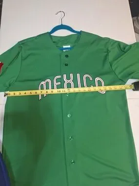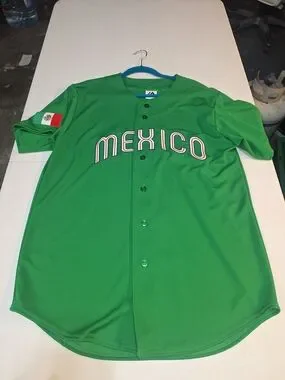 Bright green baseball jersey with "MEXICO" lettering across the chest. Short sleeves with a Mexican flag patch on the sleeve. Button-front design. Sporty, team-inspired look.