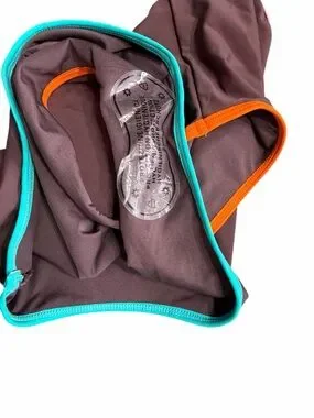 Stylish Cupshe one-piece bikini in brown. Multicolor woven straps add playful detail. Pink band under bust for contrast. Orange and teal leg trims create a pop of color. Soft, smooth fabric with a flattering high-leg cut.