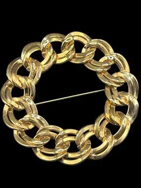 This is a vintage brooch from Monet. Made in the 1980s, the brooch is a circle or wreath made out of thick gold links. It's shiny, gold-toned metal, and it's signed "Monet"