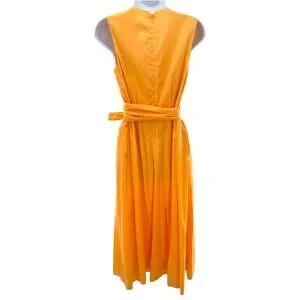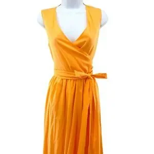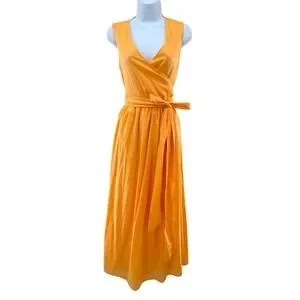 Vibrant orange sleeveless maxi dress crafted from breathable 100% cotton. This elegant piece features a flattering wrap-style V-neckline and a matching self-tie waist belt to define the silhouette. The full, flowing skirt includes practical side pockets and a back zipper closure for a seamless fit. Fully lined in soft cotton, it offers both comfort and a polished look for warm-weather occasions.
