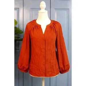 Style: Burnt orange blouse, boho chic top, peasant blouse, flowy sleeves, lightweight blouse, office chic style, minimalist elegance, everyday essential, soft textured fabric, relaxed fit top, versatile wardrobe piece, effortless style, casual to dressy, modern bohemian