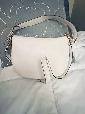 Soft pebbled leather with a curved saddle silhouette. Gold-tone turnlock and logo hardware. Top handle and adjustable crossbody strap. Clean, minimalist exterior for versatile wear.
