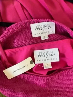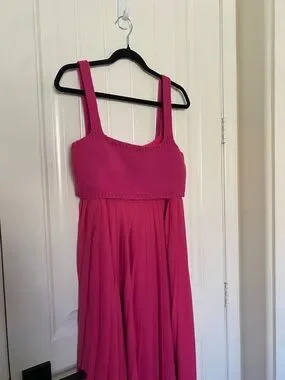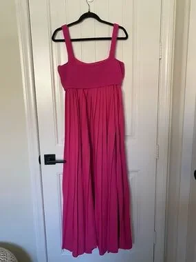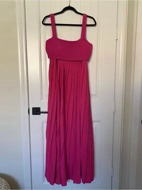 This Mare Mare pleated maxi dress in pink magenta is pure creative styling energy. The flowing pleated skirt drapes beautifully in a luxe viscose blend, while the attached sleeveless knit crop tank creates an effortlessly layered look that feels both structured and relaxed. Pullover styling keeps it easy, and the vibrant magenta colorway makes a statement. New with tags from Anthropologie 🤍✨