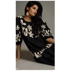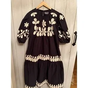 Anthropologie Embroidered Puff Sleeve Dress Floral Cotton Black Ivory XL Worn 1X