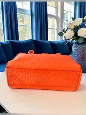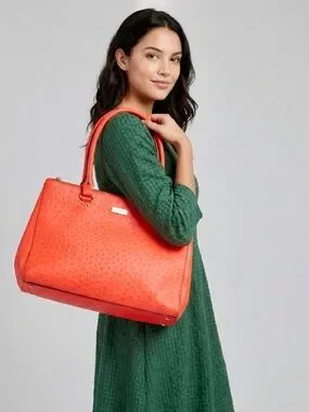 A standout piece from Kate Spade, this Wellesley Quinn tote is crafted from rich ostrich embossed leather in the vibrant “Flame” orange. The structured silhouette and textured finish give it a refined yet modern feel that’s perfect for adding a bold pop of color to your everyday look.