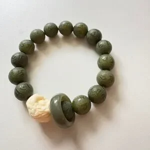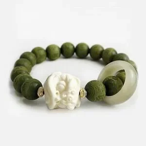 • Beautifully crafted Bodhi seed bracelet featuring intricate green-patterned beads and a hand-carved guardian lion head charm