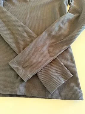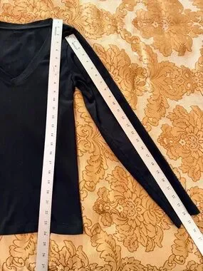 V-Neck Ribbed Long Sleeve Top - Black, Stretch, Size Small