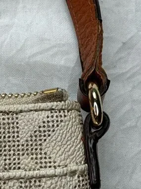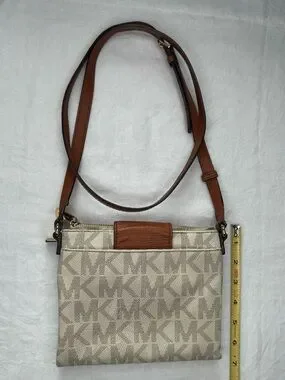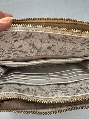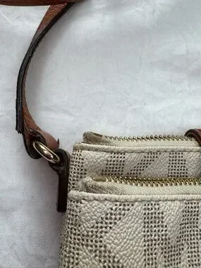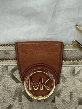 Michael Kors Fulton Vanilla signature crossbody featuring gold tone hardware and signature logo (signs of wear please see pictures). Dual zip compartments along with lots of storage space for organization adjustable shoulder strap for hands-free wear. Some discoloration along zipper, wear to straps near purse body (see picture) all zippers and snaps are in working order, 3 small stains on liner (see last picture) lots of life left she’s elegant on neutral tones for versatile styling.