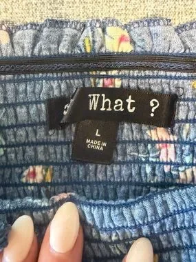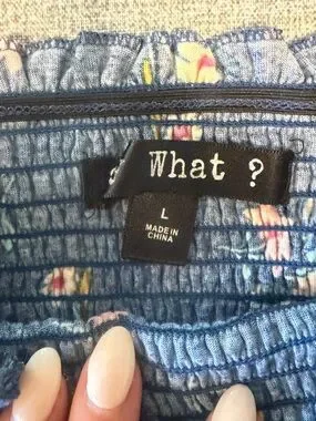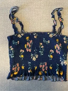 Smocked navy crop tank with colorful floral print. Thin braided tie straps and ruffled hem. Lightweight, casual summer top.