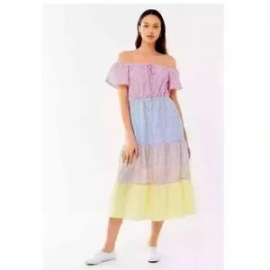 Urban Outfitters XS Off Shoulder Striped Seersucker Tiered Maxi Dress