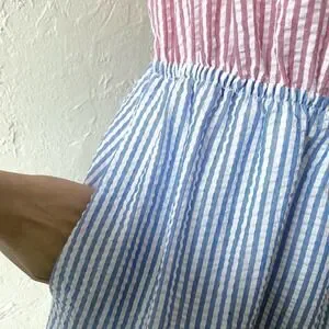 Bohemian spirit meets sunny-day charm in this delightful maxi dress. An elasticized off-shoulder neckline adds a touch of flirtatious allure, balanced by short sleeves for effortless wear. The vertical striped seersucker bodice flows into a tiered skirt with contrasting pastel hues, creating a visually captivating and figure-flattering silhouette. It also features a side pocket. Imagine yourself twirling at a garden party, enjoying a casual brunch with friends, or simply basking in the golden hour during a vacation getaway.