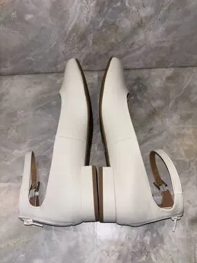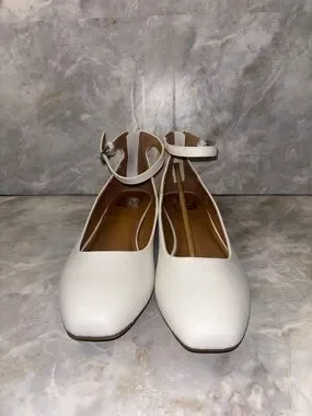 Elegant white flats featuring a square toe. Adjustable ankle strap with buckle for a secure fit. Zipper backing. Smooth upper and cushioned insole for comfort. Minimal, versatile design for everyday wear.