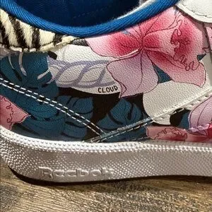 White sneakers with vibrant pink and blue floral patterns. Yellow laces add a pop of color.