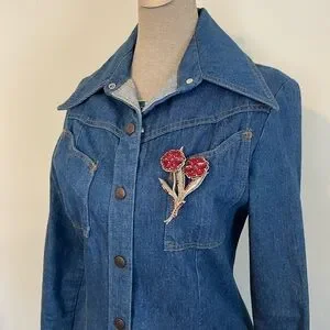 Classic timeless elegant boho bohemian denim shirt dress long sleeve button up medium blue EUC true vintage 1970 retro disco party coastal cowgirl cottagecore trendy influencer style sustainable fashion beach summer Maine nautical ocean country western shabby chic cottagecore hippie dopamine dressing trendy influencer style blue denim cotton jean shirt dress