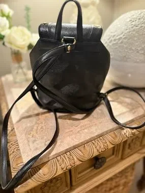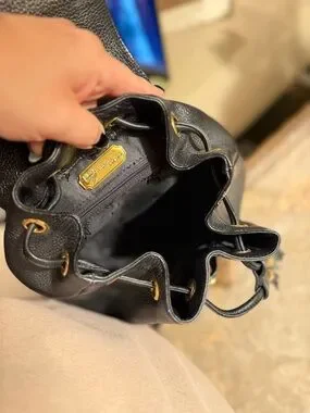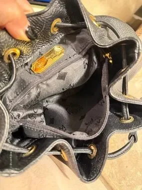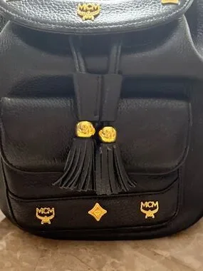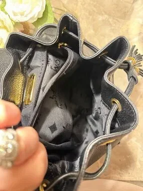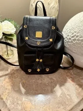 Compact MCM backpack in black leather. Signature Visetos motifs and gold-tone logo hardware. Front pocket with tassel drawstring closure. Adjustable shoulder straps for easy wear. Classic luxury styling for everyday use.