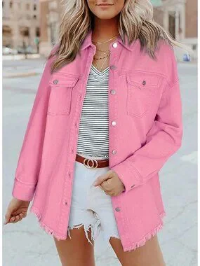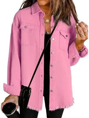 Women's Oversized Denim Jacket Long Sleeve Denim Shirt Jean Jacket B2 Pink