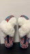 Cozy women's slide slippers with plush white faux fur crossband. Soft patterned footbed adds playful style while providing comfort. Easy slip-on design for everyday wear. The white color gives a clean, versatile look.