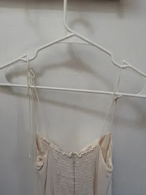 Elegant Reformation midi dress in white. Thin spaghetti straps and a fitted bodice. Smooth A-line skirt with a high side slit. Minimalist and modern silhouette. Versatile for day or evening wear. Straps have been modified, see pictures. Not noticeable while wearing.