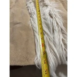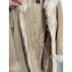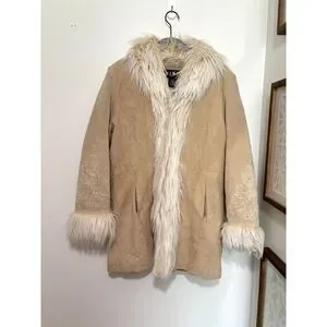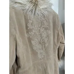 Vintage pennylane embroidered Mixit petite large suede leather coat with plush faux fur trim featuring a soft neutral tan tone, hook and eye closure, and cozy lined interior that gives it that effortlessly luxe feel. This piece leans into western boho, Y2K glam, and cozy cabincore aesthetics with subtle embroidered detailing on the sleeves and back, making it a standout statement while still fitting into quiet luxury, earthy, and minimalist wardrobes. Genuine leather exterior adds quality and structure while the faux fur brings warmth and texture. Has functional pockets and a fully lined interior. There is minor wear including a small spot on the exterior and light paint on the interior lining as shown, but it still presents beautifully and has strong vintage character that adds to its charm. Embroidered doves, ducks, swans, hearts, florals.