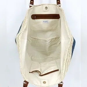 NWT Tommy Bahama 100% Straw with Genuine Leather Trim & Cotton Twill Lining W 27”/H 12,5” Natural/Blue Color