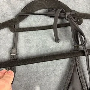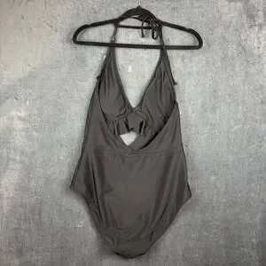 Stylish black one piece with ruffle detail. Halter neck design. Perfect for beach or pool.