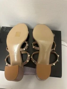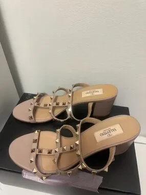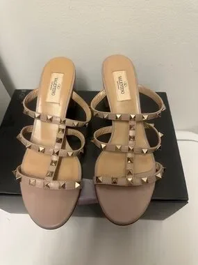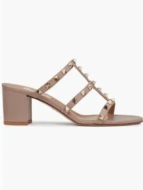 The fashion house's signature pyramidal Rockstuds spike the caged straps of this lambskin-leather slide sandal that's elevated on a chunky block heel.