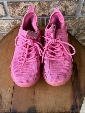 Steve Madden NY90 Sneakers Women’s Size 9.5 Pink Rhinestones These rhinestones are attached really well because there’s only one tiny one that lost its sparkle. There are a couple of small spots that are lavender. See pictures. Otherwise these are awesome looking solid and clean shoes! Pre-Loved Good!