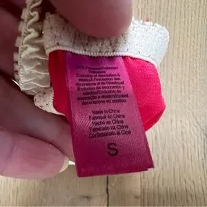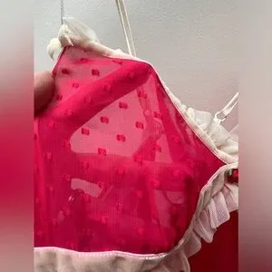 Super pretty dark pin/reddish vintage Betsey Johnson chemise and panty set in size S. Such cute details everywhere: pattern on fabric, cream ruffles and a little rose on the bodice, cream ruffles at the bottom, tie back. It is so pretty!! In excellent condition.