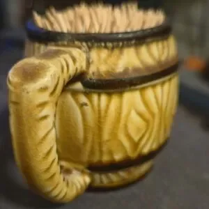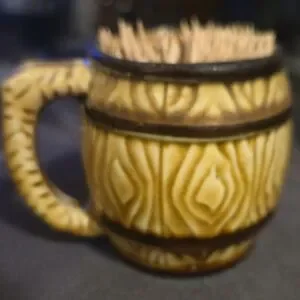 Add a touch of retro charm to your bar or kitchen with this unique mid-century toothpick holder. Shaped like a miniature ceramic barrel or beer stein, it features a glossy glaze in warm tan and brown tones with a detailed faux wood grain texture. Marked "JAPAN" on the base.