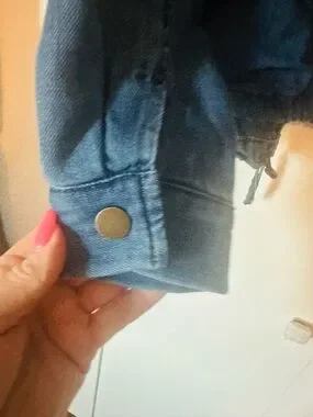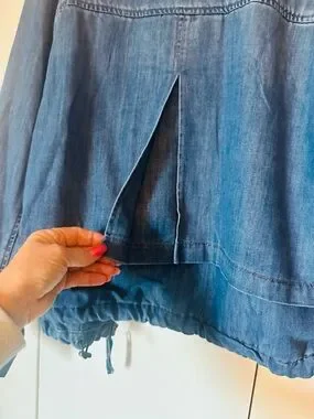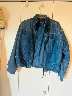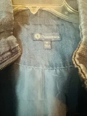 Casual Democracy denim jacket. Front zip closure and collar detail. Simple, versatile styling for everyday wear. Clean dark blue wash. this Jean coat was bought. My daughter tore the tags off, but it was never worn. Absolutely cute.