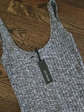 Cotton On bodycon midi dress in a grey ribbed knit with a fitted silhouette and tank-style straps. Soft, stretchy fabric with a clean, minimal look. Easy everyday or layering piece.