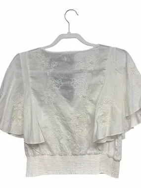 Lightweight white V-neck top with delicate floral embroidery. Flowy flutter sleeves and a smocked waist provide a flattering fit. Colorful stitched trim at the neckline adds subtle contrast. Easy-to-style piece for casual or dressy looks.