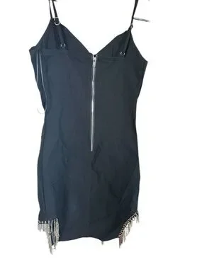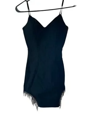 Sleek black dress with thin adjustable straps. V-shaped neckline for a stylish look. Rhinestone fringe along the hips adds sparkle. Fitted to show off figure.