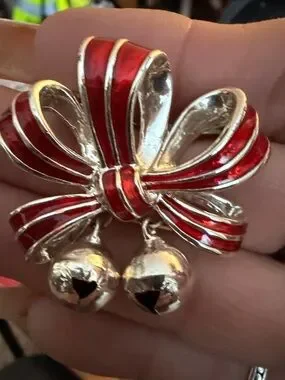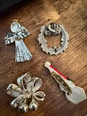 Four pins/brooches. Pictures of front and back so that you can see how they attach. The red bow has actual working jingle bells so it makes noise when you walk.